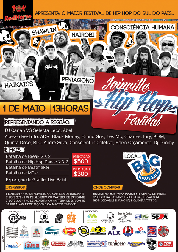 Após o sucesso da ano passado, a 2ª Edição do “Joinville Hip Hop Festival”, que reúne grandes nomes do hip hop, será no próximo dia 01 de maio, no Big Bowlling a partir das 13 horas.