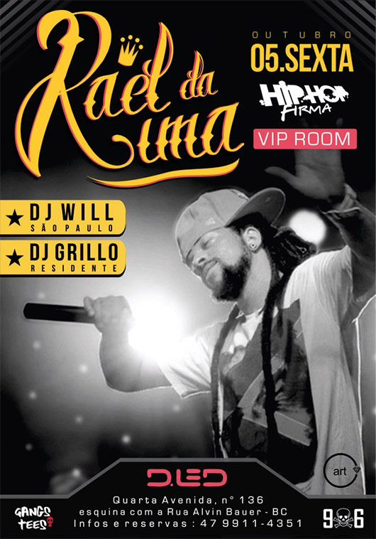 Dia 5/10 tem Rael da Rima, Dj Will e Dj Grillo no D.LED em Balneário Camboriú-SC