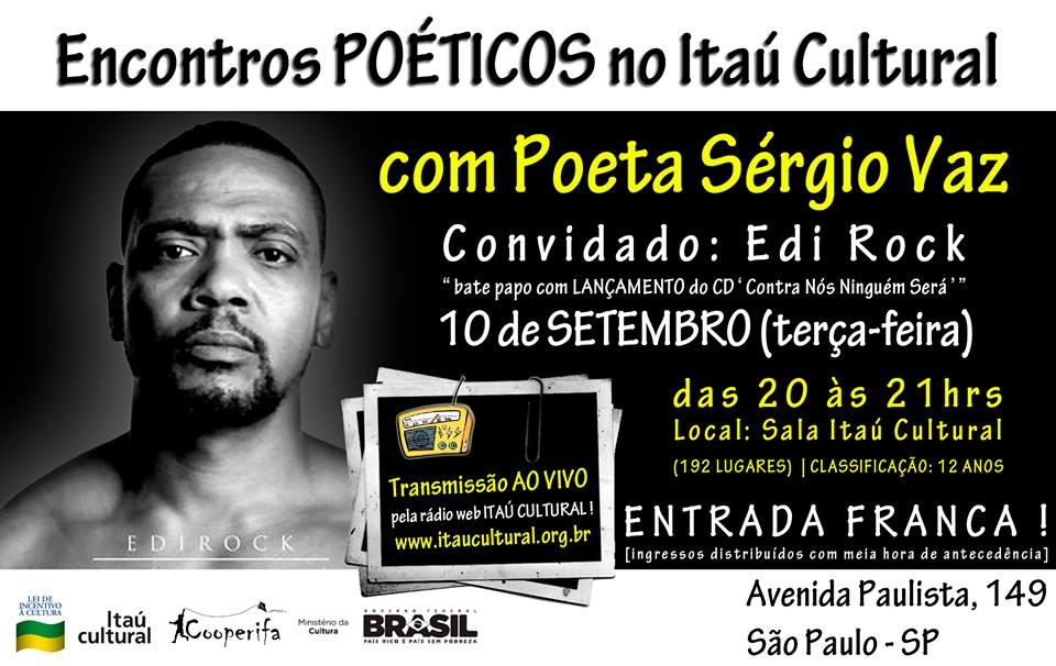 Na próxima terça-feira, dia 10, Edi Rock será o convidado especial do “Encontro Poético” comandado pelo poeta Sergio Vaz, no Itaú Cultural, a partir das 20h.