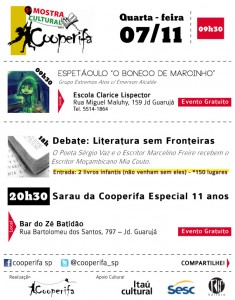 Nesta quarta-feira (7), o sarau da Cooperifa, no bar do Zé Batidão tem uma programação especial. Dentro da programação da 5ª Mostra Cultural da Cooperifa acontece o debate ‘Literatura sem Fronteiras’ a partir das 18h, com a participação escritor moçambicano Mia Couto, acompanhado pelo escritor Marcelino Freire e pelo criador do movimento, Sérgio Vaz. Em seguida acontece a festa de comemoração dos 11 anos do sarau.