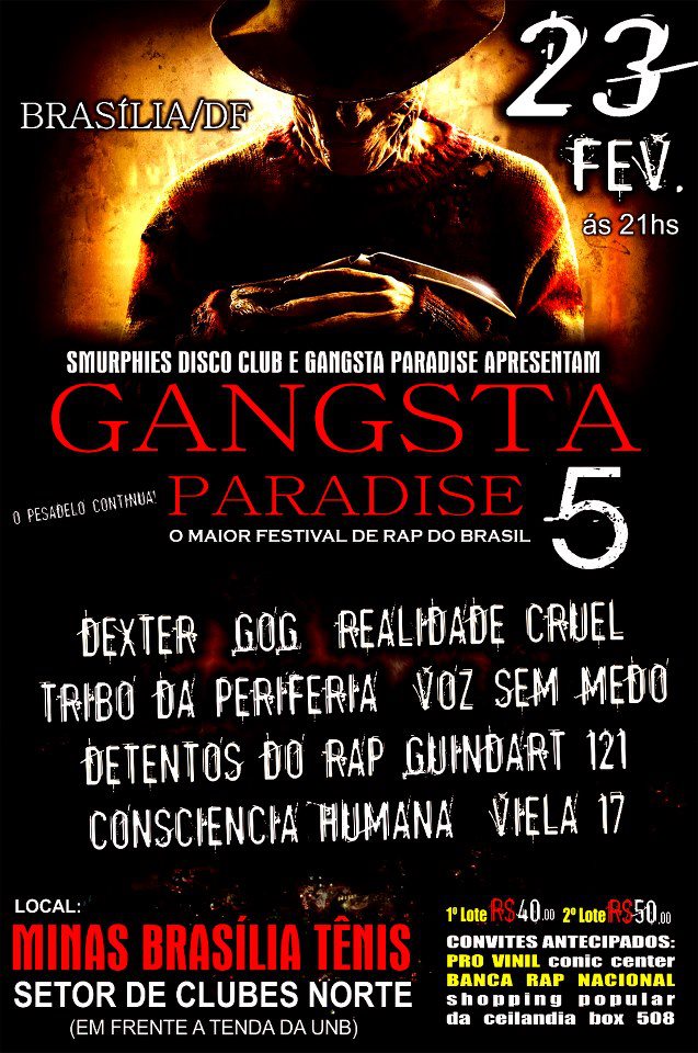 Garanta logo seu lugar nesta festa monstruosa que trará a conexão SP -DF, pois o Gangsta Paradise e o Smurphies Disco Club trará um time de peso do rap nacional: Realidade Cruel, Dexter, Detentos do Rap, Consciência Humana, Tribo da Periferia, Voz Sem Medo, Viela 17, Gog, Guindart 121 e Pacificadores.