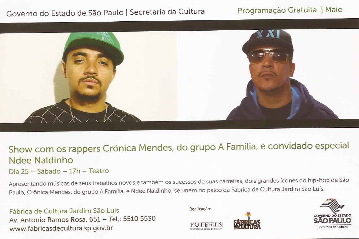 Neste sábado, 25, a Fábrica de Cultura do jardim São Luis em São Paulo, apresenta o show do rapper Crônica Mendes (A Família) com convidado especial um dos grandes pilares da nossa música rap nacional – Ndee Naldinho. Os dois sobem ao palco para apresentar ao público seus grandes clássicos mesclado com músicas inéditas, já que ambos estão em estúdio produzindo seus novos álbuns.