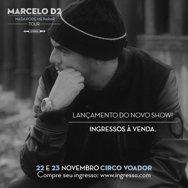 Depois de levar seu conceito de Pop Up Store para SP e NY, Marcelo volta ao Rio de Janeiro e começa a turnê do novo disco, dias 22 e 23 de novembro, com muitas novidades. Com a proposta de uma verdadeira experiência “pop art” para o público, D2 transforma cada pedaço do Circo Voador – sua casa no Rio – em uma surpresa para seus fãs.