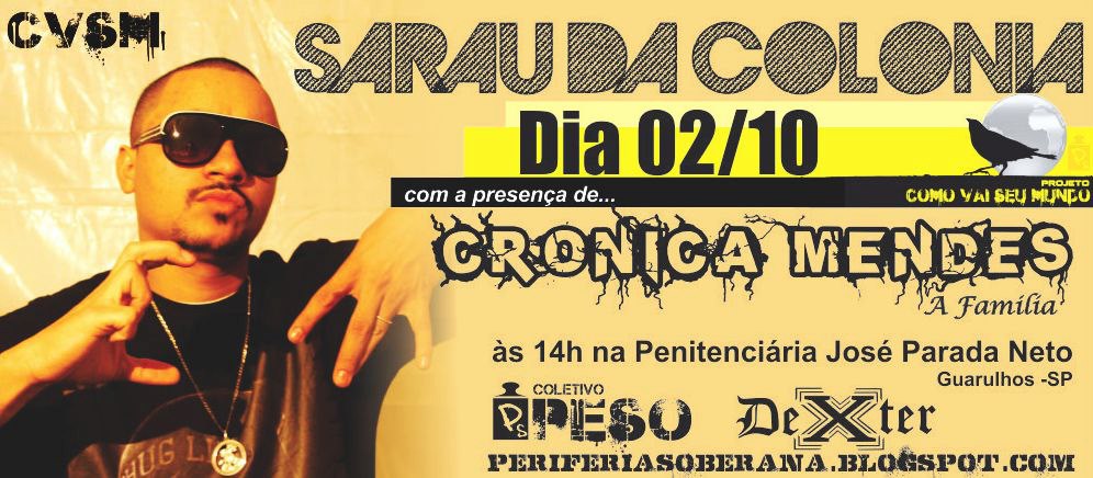 Na próxima terça-feira, 02, na Penitenciária José Parada Neto, o Projeto Como Vai Seu Mundo (CVSM), fruto da parceria entre o Rapper Dexter, Coletivo Peso e Instituto Crescer, receberá o rapper Crônica Mendes, do grupo A Família, para mediar a atividade de RAP, Militância Social e Poesia. A idéia é fortalecer o RAP e a Poesia como meios de politização, mobilização e ativismo, incentivando a produção literária e musical entre os detentos da unidade. O músico irá expor sua experiência, dialogar a partir do seu ponto de vista e fomentar a produção de poesias, versos e trovas para a realização do Sarau da Colônia que acontecerá na segunda metade do dia. O Sarau foi fundado no dia 11 de setembro deste ano e contou com a presença do poeta baiano Nelson Maca, do coletivo Blackitude.