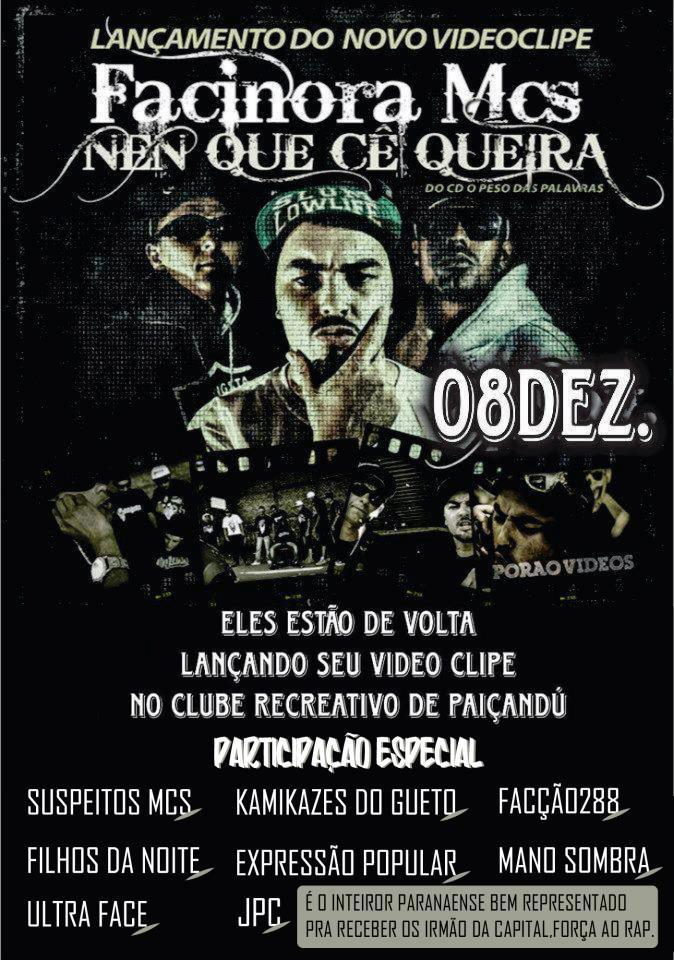 Sábado (08) tem show de lançamento do videoclipe “Nem que cê queira”, do Facínora MC’S, no Clube Recreativo do Paiçandú, PR, com a cobertura especial da Revista Rap Nacional.