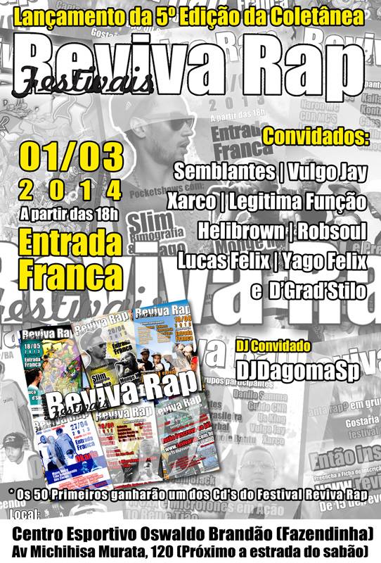 No dia 1º de Março o Festival Reviva Rap começa oficialmente o ano de trabalho, fazendo o lançamento de sua 5ª coletânea, que conta com a participação de 15 grupos, inclusive 3 grupos da Bahia e 1 de Goias. O lançamento do Cd abre também as comemorações de 5 anos do projeto, que em seu 5º aniversário está planejando ações especiais e diferentes, mas com o mesmo intuito de sempre, fortalecer o rap nas comunidades!