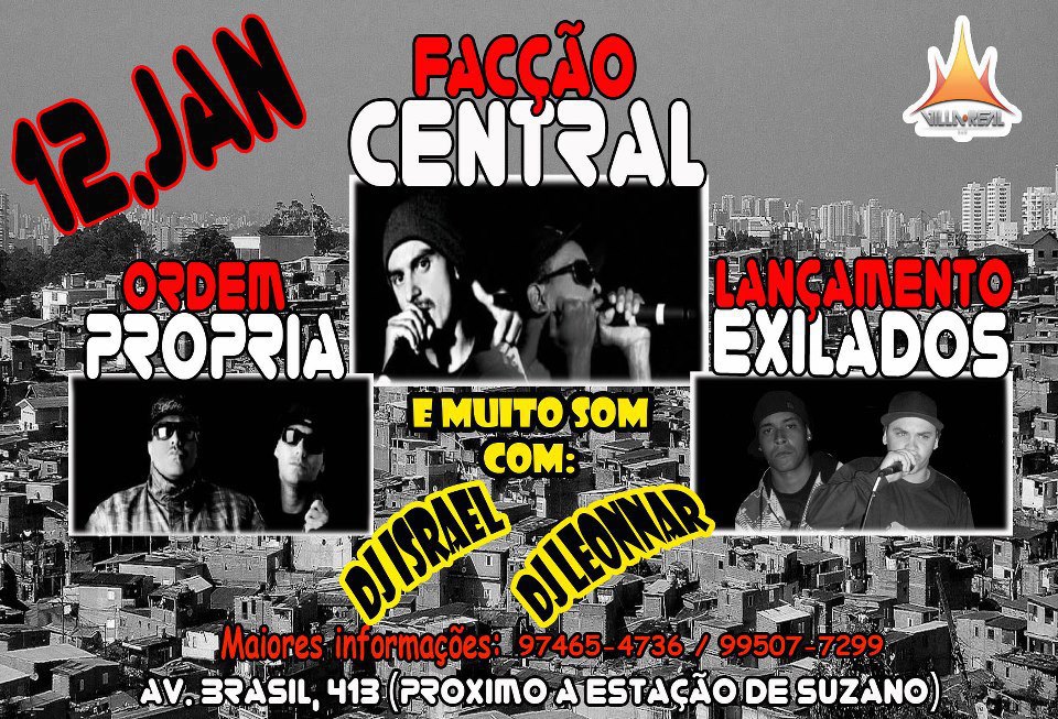 Sábado (12) Suzano-SP será palco de um grande show de rap nacional, com Facçâo Central, Ordem Própria, no show que marca o lançamento do grupo Exilados.